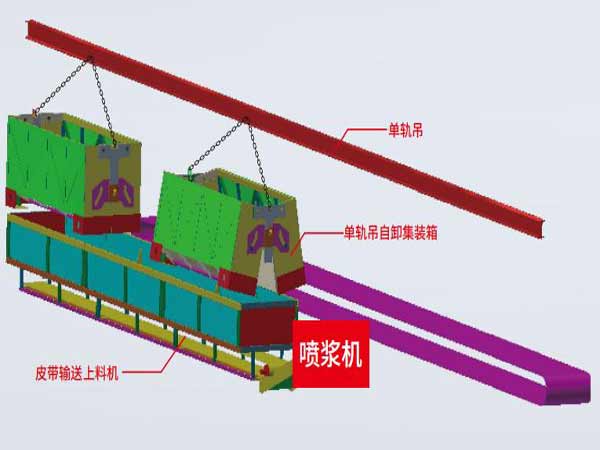 我公司與相關院校合作,研發(fā)單軌吊自動上料搭配推鏈式混凝士噴射系統(tǒng),該系統(tǒng)依托礦井下的單軌吊運輸系統(tǒng),通過單軌吊自卸集裝箱、低皮帶機運料輸送系統(tǒng)、混凝土噴射機組組合,實現(xiàn)井下自動上料、輸送、噴漿一體化集成系統(tǒng),有效地提高了混凝土噴射效率,減輕了操作人員的工作強度,將人員從繁重的上料工作中解放出來。為礦山智能化建設添磚加瓦!